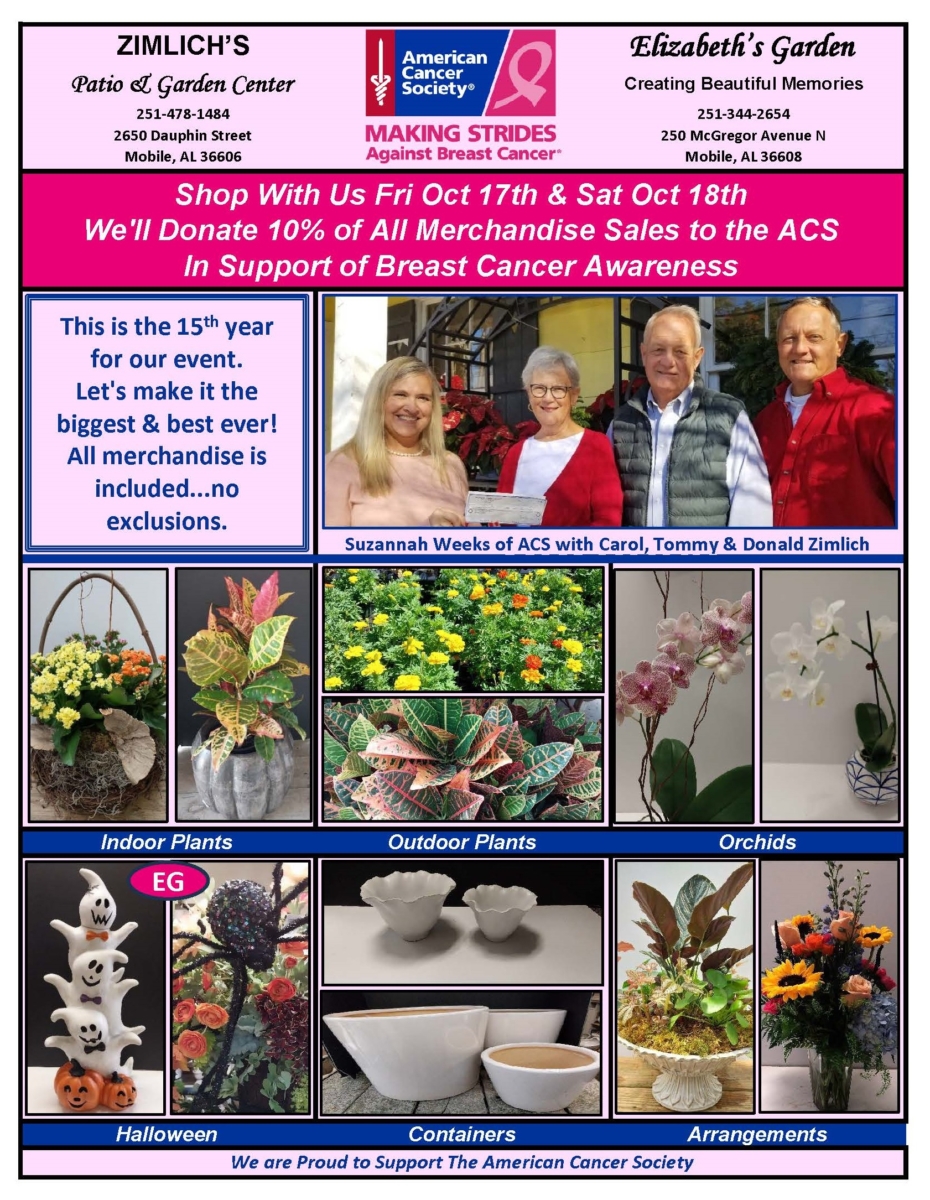 Starting tomorrow through Saturday, help us support The American Cancer Society. On those two days, we will be donating 10% of all our merchandise sales to The American Cancer Society’s Breast Cancer Awareness promotion. All merchandise is included in the promotion: Garden plants, arrangements, Orchids, containers, soil, statues, and more. This is our 15th year in support of this event and we need your support to make this the biggest event ever. And you will be making the outside and inside of your home beautiful and exciting for fall. We will see you tomorrow for our Fall workshop and the start of Breast Cancer Awareness.